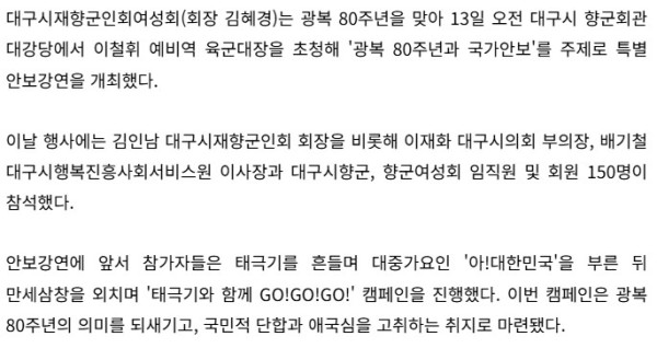 대구시재향군인회여성회 '광복 80주년과 국가안보' 강연