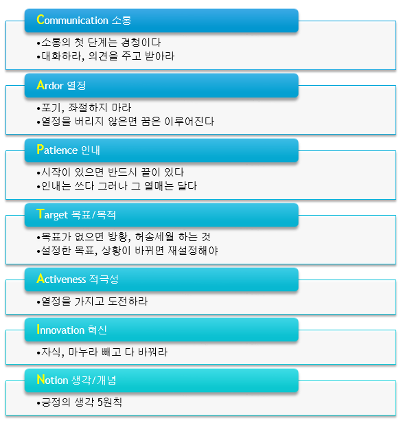 2014년 5월 [이사장 STORY] 게시판에 연재를 시작한 “캡틴십(Captainship)”이 8회에 걸쳐 완결되었습니다. 캡틴십은 캡틴, 즉 리더가 갖추어야 일정 수준 이상의 공통된 자질과 능력 그리고 지도력과 통솔력을 말하는 것으로 7가지 자질로 나누었습니다.