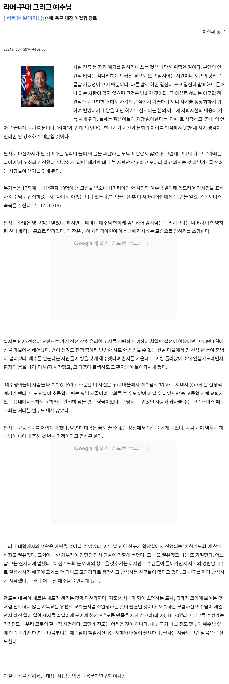 상하좌우 소통 한국기독공보> 이철휘장로 칼럼 [라떼-꼰대 그리고 예수님] 페이지 정보 작성자 최고관리자 작성일 24-06-30 19:10 조회 2,279회 댓글 0건 본문 한국기독공보>[라떼는 말이야!] 육군 대장 이철휘 장로 칼럼라떼-꼰대 그리고 예수님 한국기독공보 (pckworld.com) 이전글한국기독공보> 이철휘장로 칼럼 [창끝이 중요한 '군선교'] 다음글( 보도자료. 프레스센터 기자회견. 미 텍사스주 및 한국에서 참전용사 초청 행사 실시 목록 댓글목록 댓글목록 등록된 댓글이 없습니다.