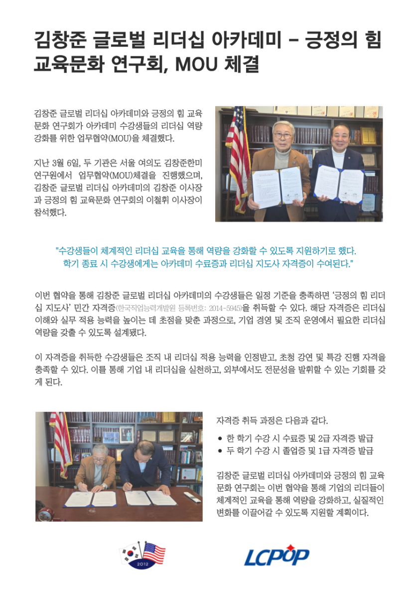 리더십 자격증 교육 긍정의 힘 교육문화 연구회, 길창준 글로벌 리더쉽 아카데미와 MOU 체결 페이지 정보 작성자 최고관리자 작성일 25-03-10 03:33 조회 1,697회 댓글 0건 본문 저희 긍정의 힘 교육문화연구회가 길창준 글로벌 리더쉽 아카데미와 MOU를 체결하였습니다. 자세한 내용은 사진 속 본문을 참조바랍니다. 이전글김창준 글로벌 리더십아카데미 수료식 다음글긍정의힘리더십지도사 자격취득현황 검색 목록 댓글목록 댓글목록 등록된 댓글이 없습니다.
